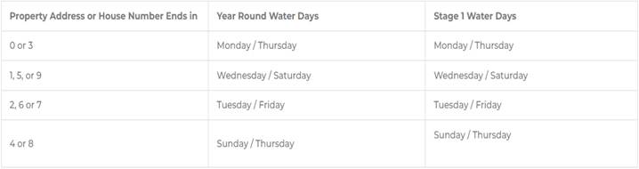 Twice per week watering restrictions remain in effect. Please take the time to adjust your irrigation systems to follow the year-round watering schedule. Keep in mind that after you make changes to your irrigation timer you should verify that it is following the schedule as expected. Please follow the schedule for your address.